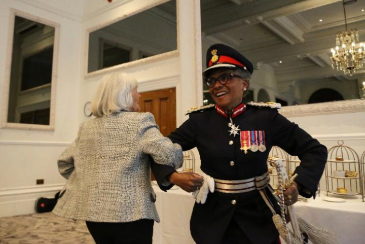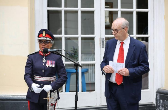 After a few congratulatory words on bringing this project to fruition, the Lord Lieutenant of Bristol Peaches Golding OBE conveyed the greetings of King Charles III; drew her sword and unveiled the plaque with her sword.